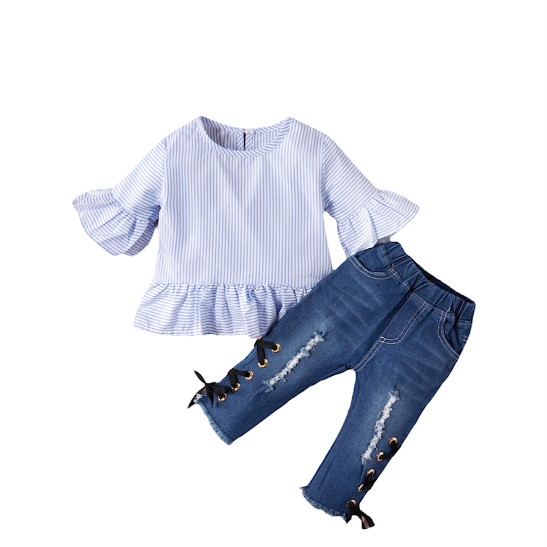 Striped ruffle top with distressed jeans. Perfect for daily wear or any event!